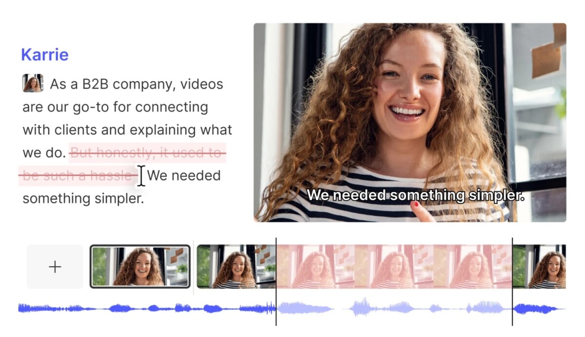 Its AI co-editor removes filler, tightens pacing, adds automatic captions and transcriptions, and creates short-form clips without traditional timeline editing.