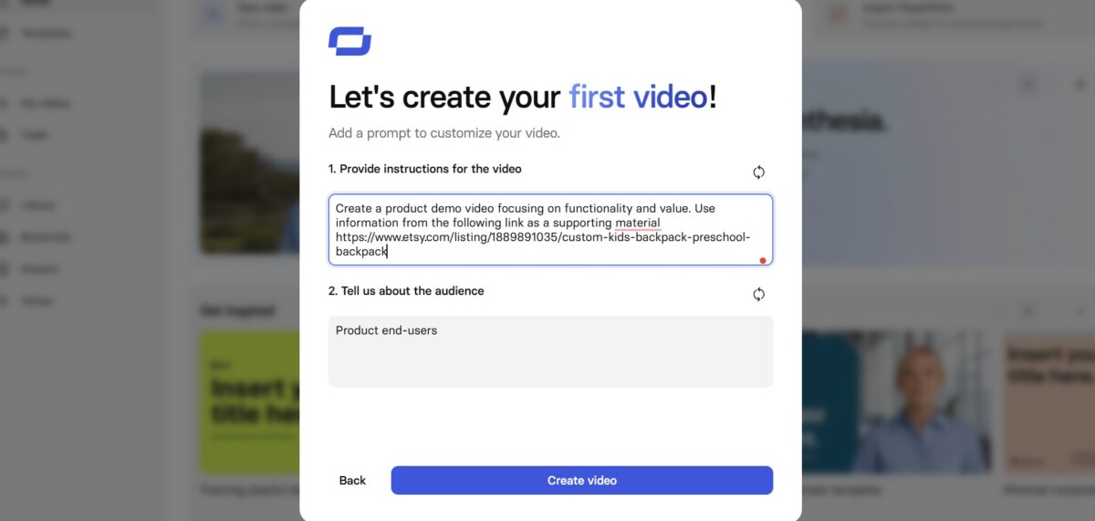One of the AI video tools for ecommerce that makes this possible is Synthesia. Simply type a prompt, upload your script, or paste your webpage URL.