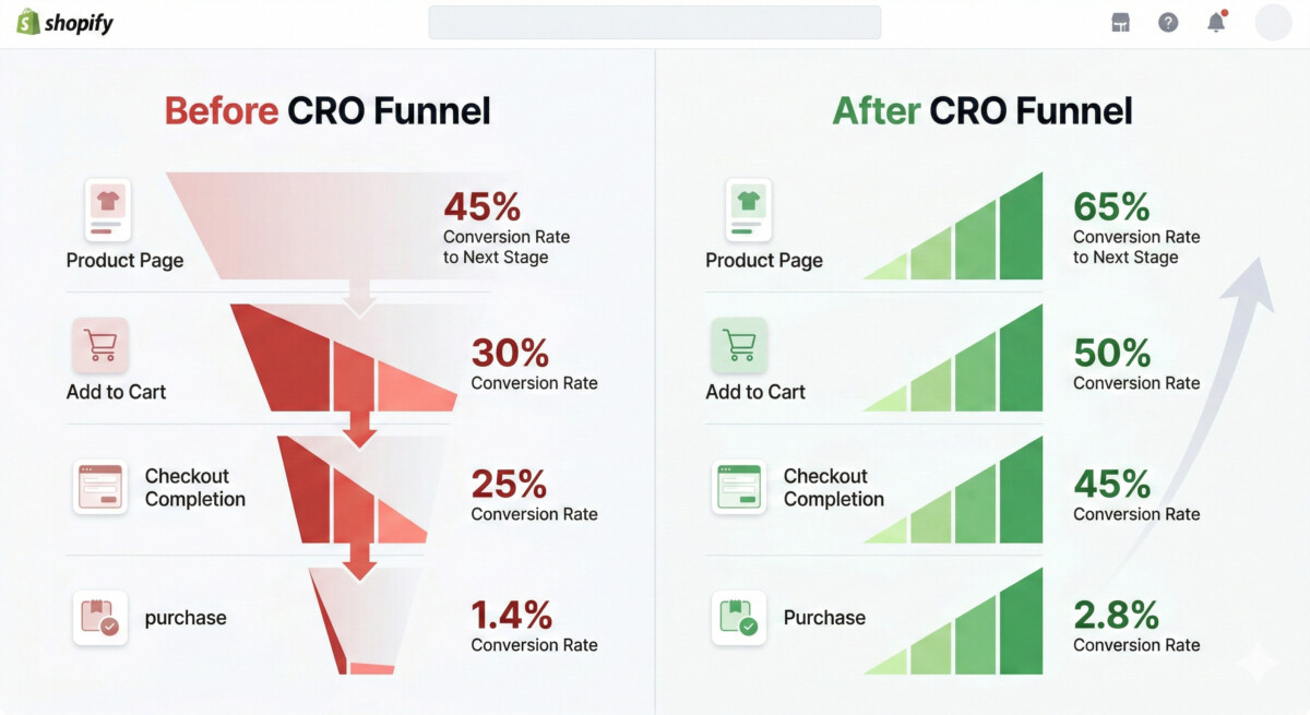 Here is the math that makes CRO the highest-ROI investment most Shopify merchants can make. If your store is doing 10,000 monthly sessions and converting at 1.4%, you are generating 140 orders per month. If your average order value is $85, that is $11,900 in monthly revenue.