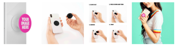 You can also show product images that indicate the scale of your product, whether it’s large or small. In the above examples, PopSocket provides users with multiple angles of their product in use so a shopper can envision using the Custom PopGrip on their phone.