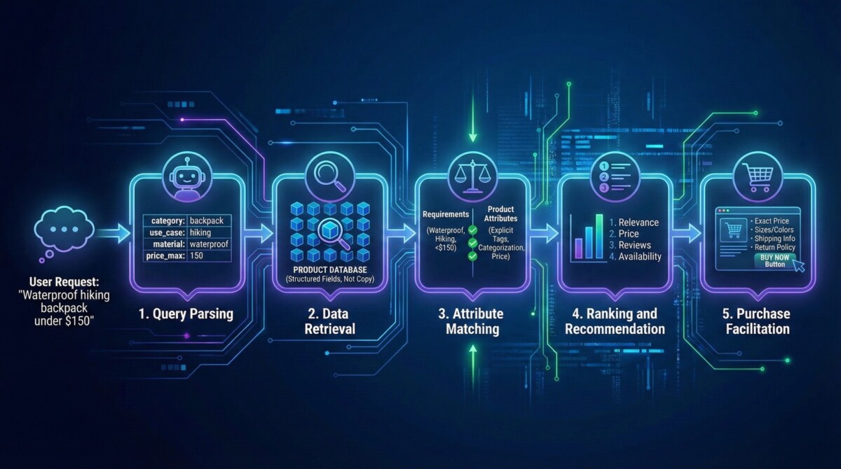 Step 3: Attribute Matching – The agent compares customer requirements against your product attributes. Does your backpack have “waterproof” explicitly stated? Is it categorized as “hiking”? Is the price under $150?