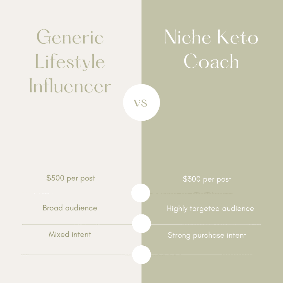 Now compare that to a keto coach with 25K highly focused followers. They charge $300 per post. Their entire audience is obsessed with nutrition, macros, and supplements.
