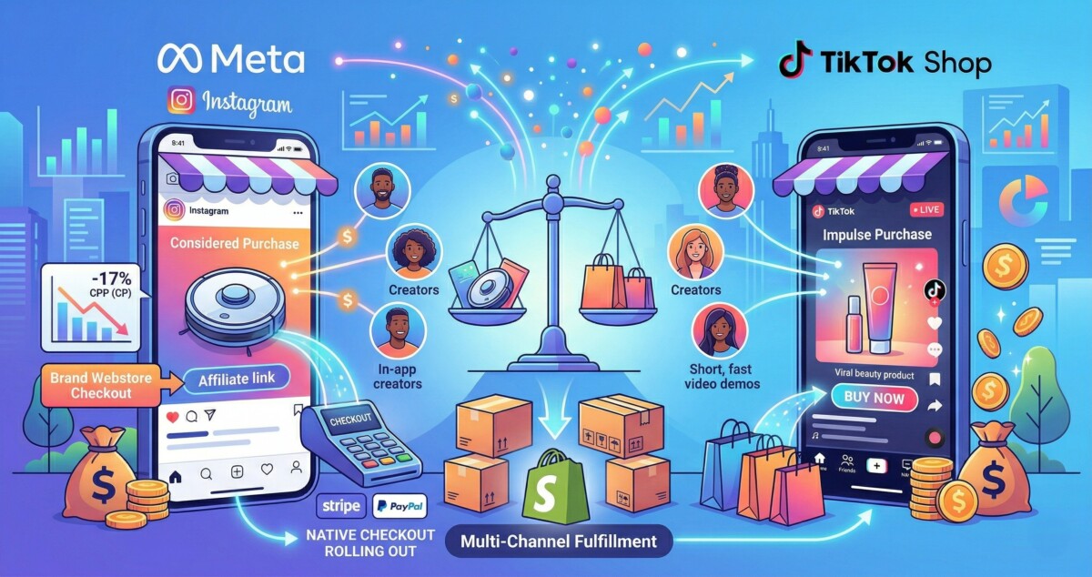 The checkout experience gap is real but narrowing. TikTok has fully native in-app checkout, which removes friction and keeps the entire transaction inside the platform. Meta’s affiliate commerce currently sends buyers to the brand’s site on Instagram, with in-app checkout coming as the Stripe and PayPal integration rolls out. That friction difference matters for impulse purchases but matters less for considered purchases where the buyer is already motivated. The Product Set Optimization data Meta shared internally, showing 17% lower median cost per purchase versus standard campaigns, suggests the platform is already closing that gap in conversion efficiency even before in-app checkout is universal.