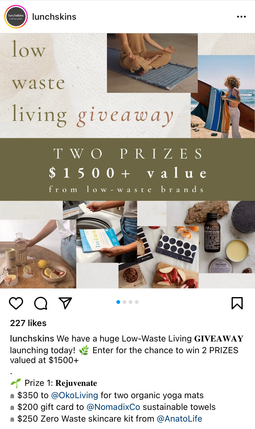 Lunchskins runs generous giveaways to encourage people to promote the brand. In this one, users must follow six different accounts and enter via the link in the brand’s bio. For any additional entries, users can tag other accounts in the comments.