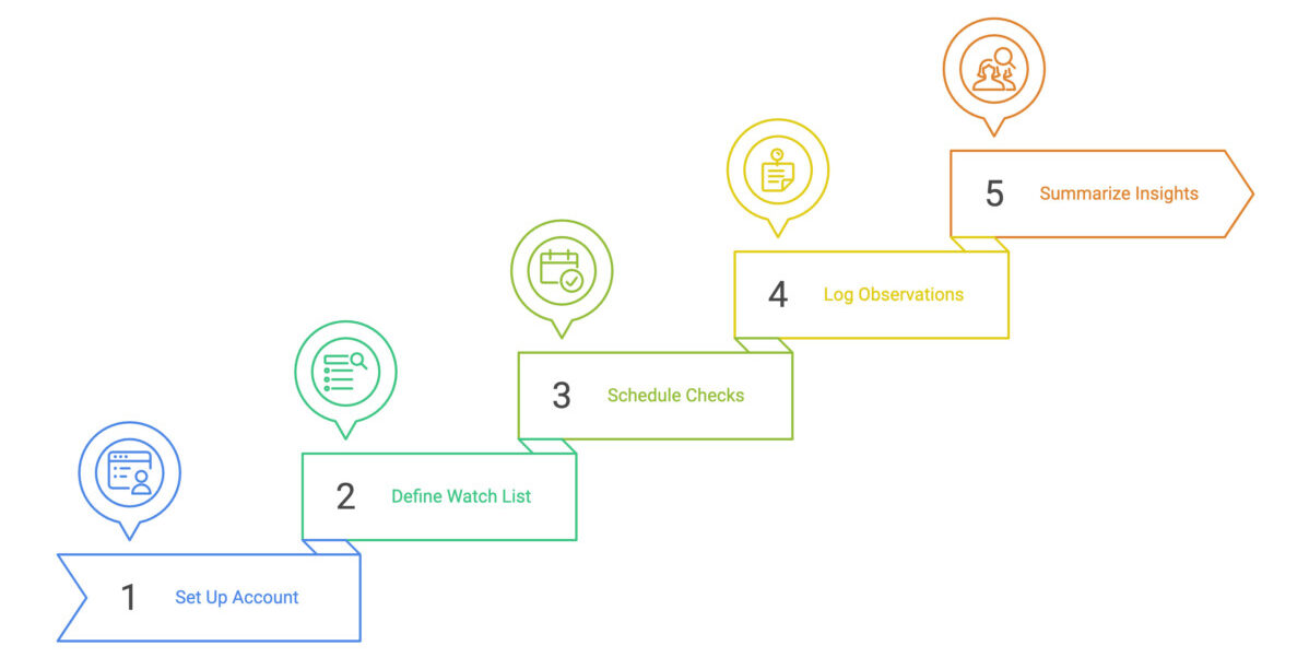 Competitive Intelligence Workflow: Outline steps: set up anonymous account, schedule story checks, log insights.