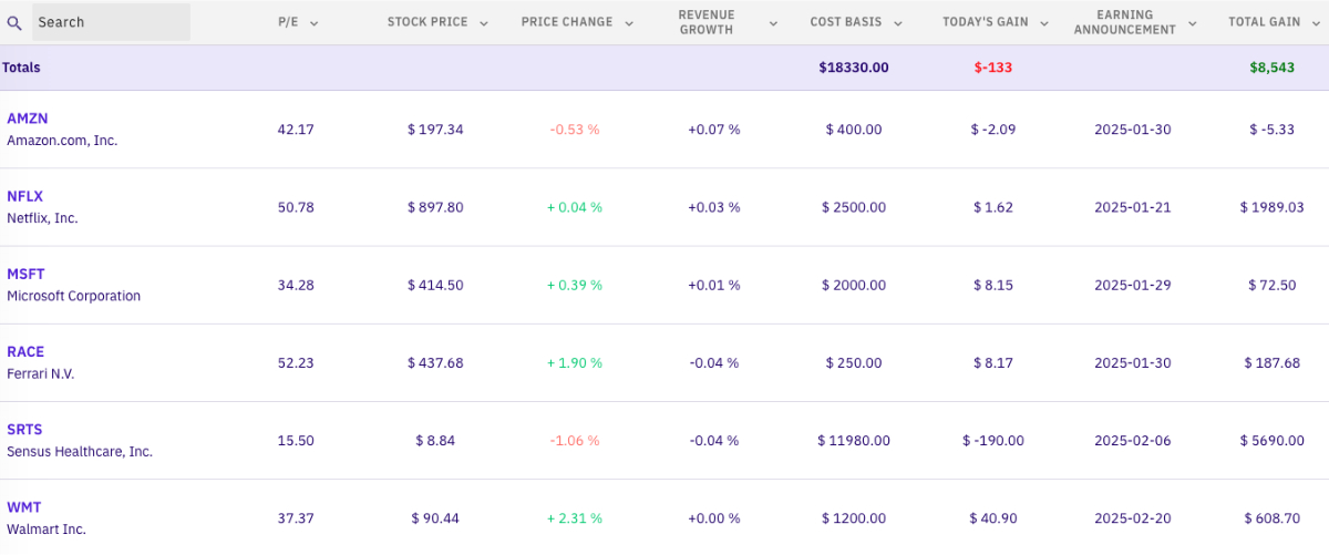 Like many brokerage systems, you can set up watchlists for stock you want to buy or own. What’s different is you can also set up metrics to track alongside your watchlist, enabling you to keep an eye on valuations, revenue growth, and upcoming earnings events from one view. You can also paper trade and track wins/losses.