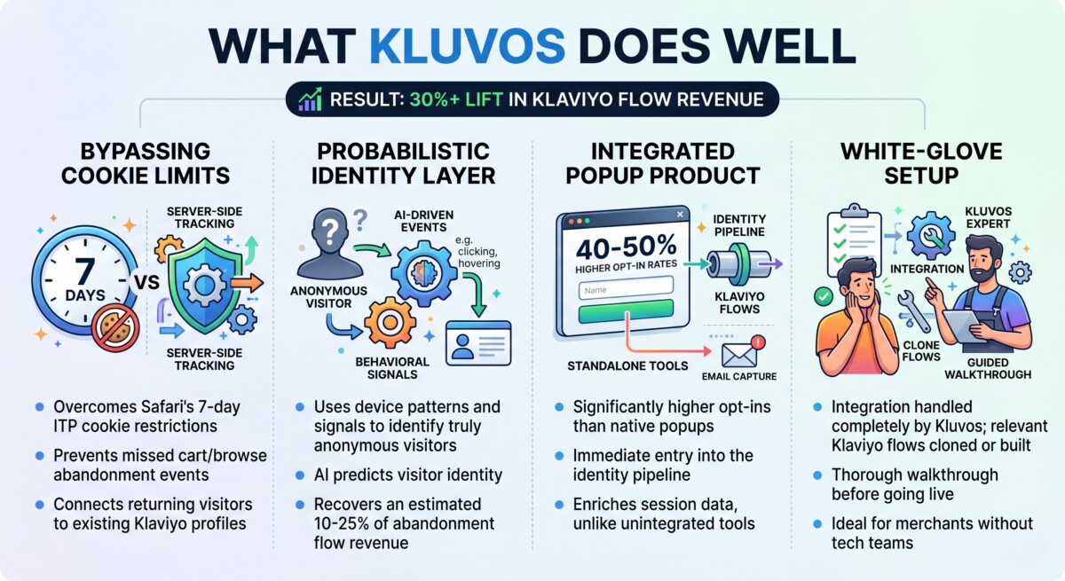 Klaviyo’s Extended ID, announced in late 2024, extends native identity tracking for up to one year using Klaviyo’s first-party identity graph, and it is included at no additional cost for paying Klaviyo customers. Kluvos adds probabilistic identity resolution (matching anonymous visitors using device patterns and behavioral signals) and a connected popup product that feeds new opt-ins directly into the identity pipeline from the first session. The two tools address overlapping problems from different angles: Klaviyo Extended ID improves native tracking for known profiles, while Kluvos focuses on recovering events for visitors who have never been identified or whose cookies have been cleared. Merchants using Kluvos alongside Klaviyo Extended ID may see additive benefit, though the degree of overlap depends on what percentage of your traffic is returning known visitors versus genuinely anonymous new sessions.