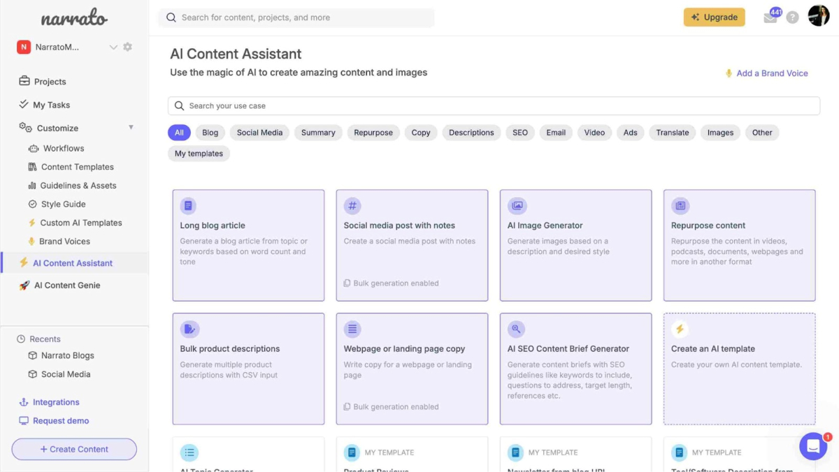 Narrato AI is a must-have in your digital toolbox in 2025. Designed to streamline content creation with its all-in-one AI capabilities, this powerful AI content platform provides features like AI copywriting, SEO content optimization, and AI image generator. It comes with a versatile AI copywriter and over 100 AI templates for headline generation, AIDA/PAS/BAB copywriting, bulk product description generation, content translation and improvement.