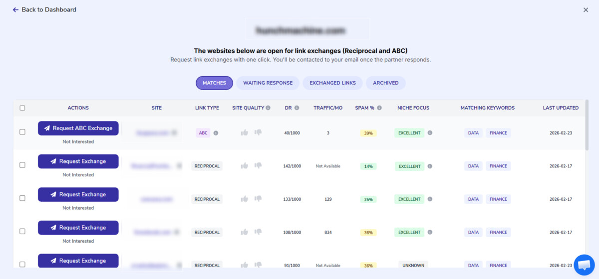 - The platform finds relevant sites in your niche and lets you evaluate all relevant website metrics