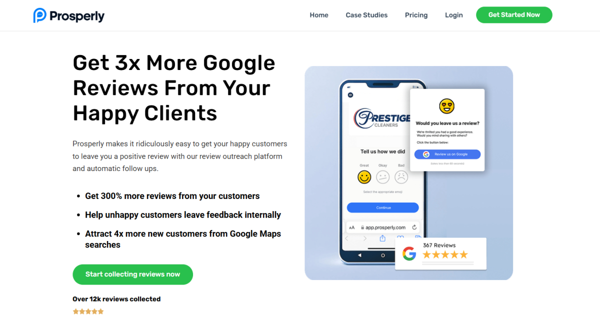 Prosperly is a reputation management tool focused on helping businesses collect more Google reviews but the tool will work with other review platforms as well.