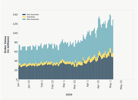 Now that they are past the hoarding of toilet paper and stocking up on a month’s worth of snacks, many consumers have moved on to purchases that will make them more comfortable or bring them joy. This means that apparel brands, online book merchants, and even (in recent weeks) jewelry merchants, are seeing sales growth. Additionally, spending has been redirected from eating out in restaurants to spending on items for home or food ordered-in.