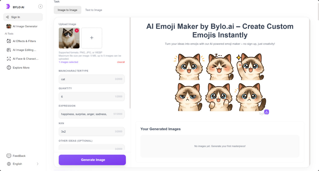 Open Bylo.ai’s emoji maker online and decide whether you’re building emojis from words, images, or both. A simple plan helps: pick a small “starter pack” of reactions your customers use often (happy, begging, surprised, “treat time,” “sold out”).