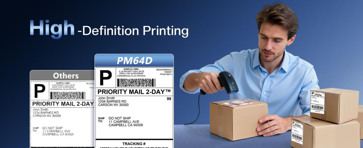 The PM64D prints standard 4 × 6-inch shipping labels in about one second, with a 203-DPI resolution that keeps barcodes and addresses crisp and scannable across major courier systems. This helps reduce misreads and maintain steady shipping workflows.