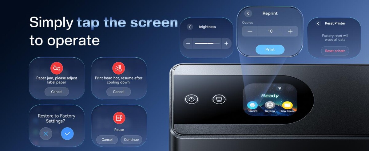The printer includes a built-in touchscreen that shows Bluetooth status and label calibration in real time. This visual feedback helps prevent misprints and saves time during setup. A QR-code guide on the display offers quick tips for calibration and maintenance, keeping the process straightforward even for new users.