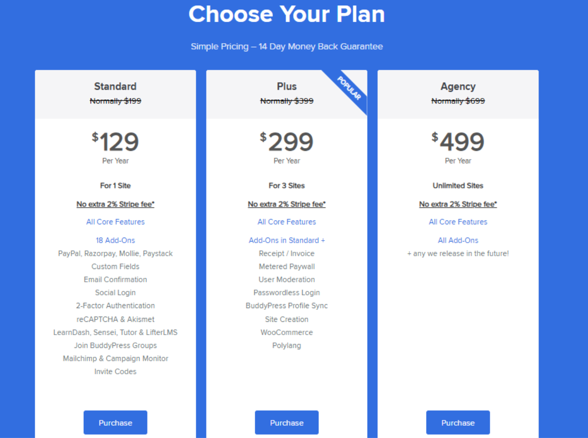 Standard: At $129 per year, this plan allows you to use ProfilePress on a single website. It eliminates the 2% Stripe fee and integrates with Mailchimp, Campaign Monitor, and popular learning management systems like LearnDash and LifterLMS. Standard is a great option.