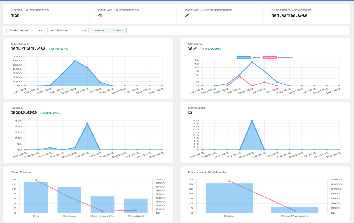 ProfilePress offers a reporting and analytics dashboard that provides valuable insights into user activities and website performance, including data on membership signups, subscription renewals, cancellations, taxes, and refunds.