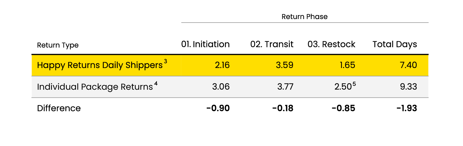 Happy Returns offers unique advantages when it comes to efficiency on both sides of the transit phase, as illustrated in the table below: