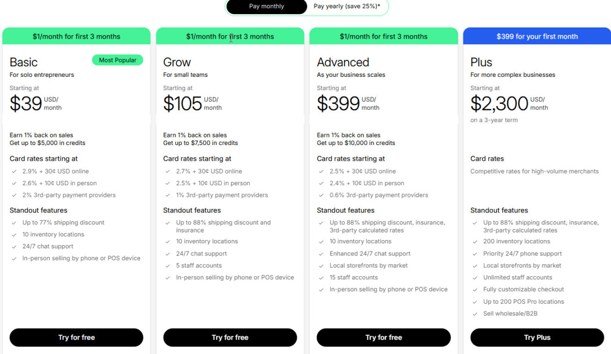 Shopify offers multiple plans, and your monthly subscription is the base cost you’ll pay whether you sell one product or a thousand. In the examples from the reference guide, common plan prices shown include Basic ($39/month), Grow ($65/month), and Advanced ($399/month).
