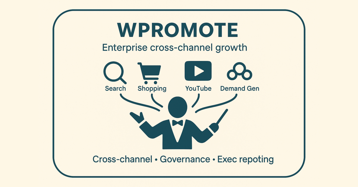 Wpromote fits mid‑market and enterprise Shopify brands that need orchestration across Search, Shopping, YouTube, and Demand Gen. They deploy the three layers but add governance—planning cycles, forecast ranges, and stakeholder‑ready reporting that tracks MER, POAS, and verified lift. The brand is fully protected. PMax is segmented with brand exclusions, margin‑informed tROAS, and New Customer Acquisition bonuses, supported by an asset pipeline that refreshes before fatigue. Search becomes a portfolio of intent clusters that graduate from PMax Insights, each with bespoke copy and active negatives. Budgets start around 10/50/40 and adjust based on 14‑day streaks and saturation, keeping executives confident while you scale.