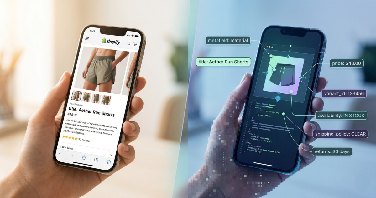 A second customer has arrived at your store. It doesn’t scroll your homepage. It doesn’t respond to lifestyle imagery or social proof badges. It doesn’t feel the urgency of a limited-time offer. It is a piece of software, an AI agent, acting on behalf of the same human shopper you’ve always served. And it evaluates your store in a completely different way. It queries your product data. It reads your shipping policy. It checks your return terms. It parses your variant structure. And it makes a recommendation in milliseconds based entirely on the quality and completeness of your structured information.