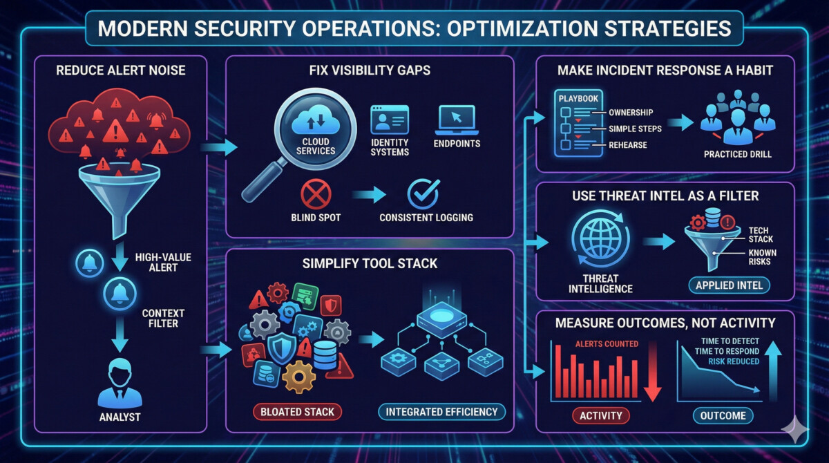 A SOC gets stronger when you reduce noise, improve visibility, simplify tools, and run clear response playbooks that real people can follow under stress. If you implement only one change this week, start by cutting alert volume and adding better context, because that single move lowers burnout and improves detection at the same time. Next, pick one gap to close (cloud logs, identity visibility, or response ownership), set a 30-day target, and track improvement with simple outcome metrics. If you want to go further, audit your access controls, asset inventory, and key vendor risks, then align your SOC workflows to those realities so security supports growth instead of interrupting it.