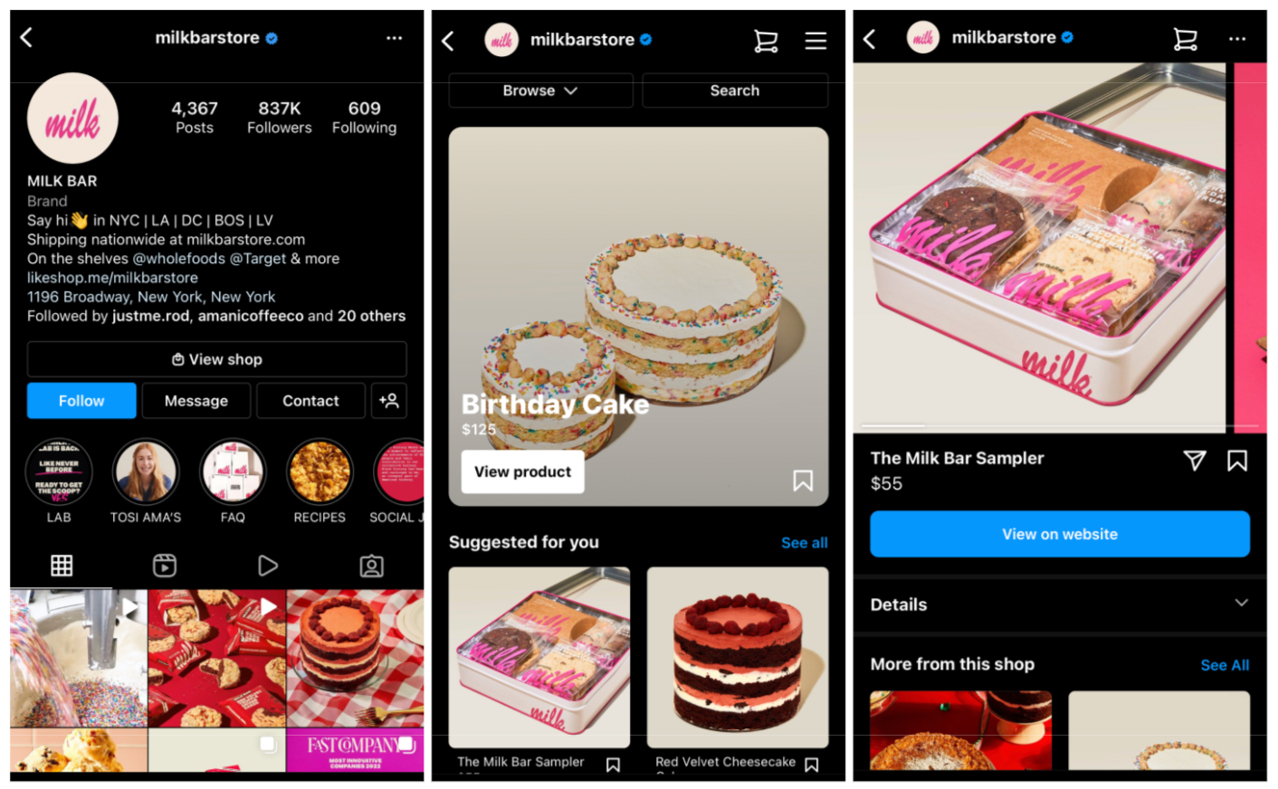 Before the beginning of the pandemic in 2020, 75% of Milk Bar’s revenue came from its physical stores and the rest came from online sales. The pandemic changed that. Christina leaned on Instagram—and subsequently on its social commerce features—which played a key role in Milk Bar’s success ever since.