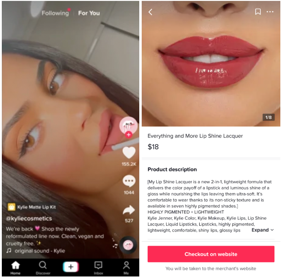 Kylie Cosmetics can tag its product in TikTok videos and send viewers to an in-app product page, which can then lead them to the website to make a purchase.