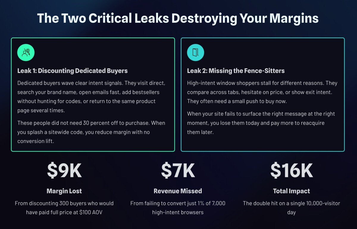 Quick math makes it real. Picture 10,000 visitors. A slice, say 300, are die-hard buyers. They would have paid full price. You hand them 30 percent off anyway. That is pure margin lost. Then, consider 7,000 high-intent browsers. They are comparing, hesitating, or tab-hopping on mobile. They never see a targeted message or timed nudge, so they bounce. You end up with a record revenue day and a weak P&L.