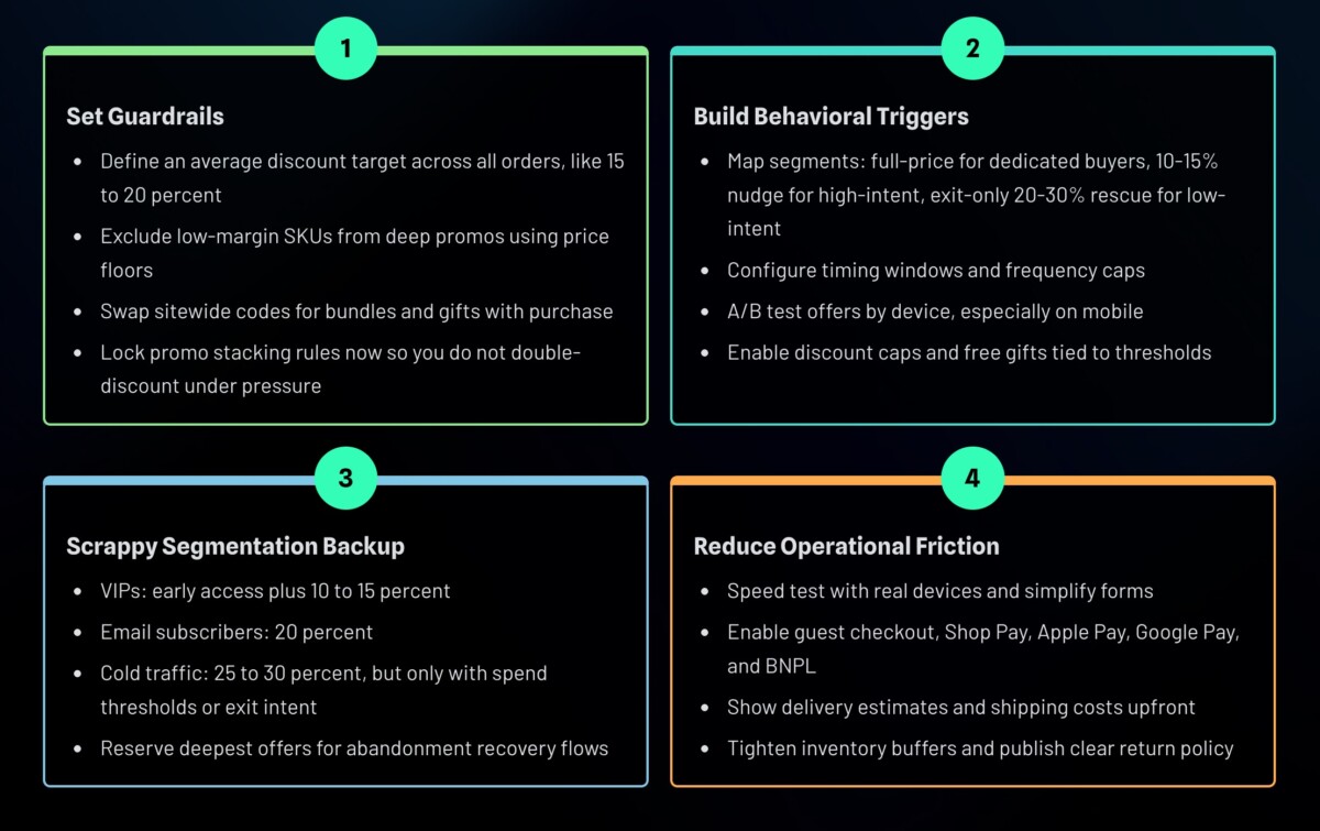 - Set thresholds to auto-adjust offers if average discount drifts up or conversion dips on key pages