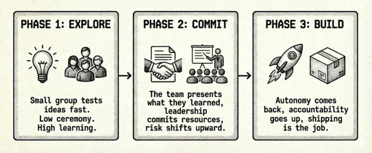 Commit: The team presents what they learned, leadership commits resources, risk shifts upward.