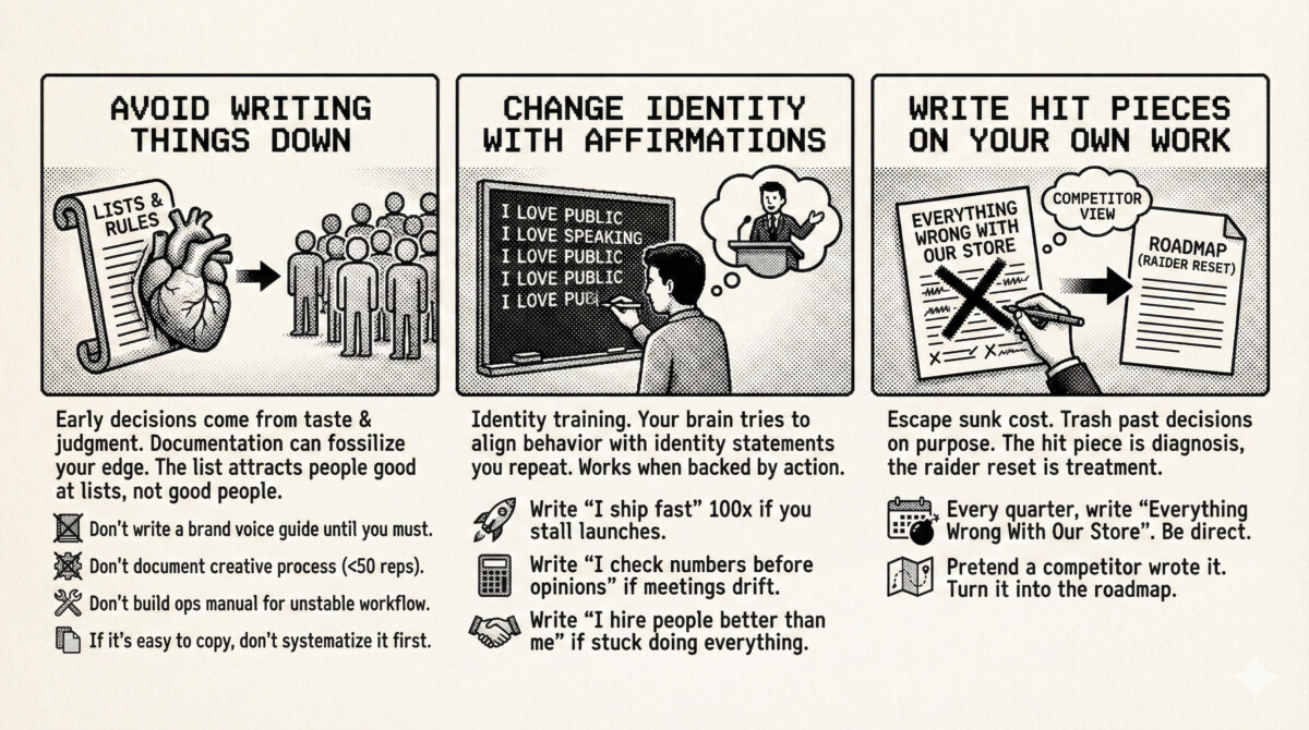 Documentation is useful, but it can also fossilize your edge. Lütke’s point is that the best early decisions often come from taste and judgment, then companies try to turn that into a list. The list attracts people who are good at lists, not people who are good.