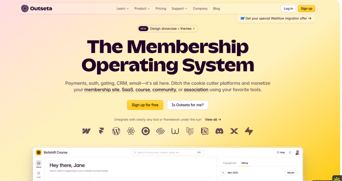 Outseta is an all-in-one membership platform that combines subscription billing, CRM, email marketing, help desk, and member authentication into a single system. The platform is designed specifically for SaaS companies and membership-based businesses, helping them scale from startup to their first $10 million in revenue. Creators can build membership sites with protected content, manage all member data in one place, and accept recurring payments through integrated Stripe checkout.