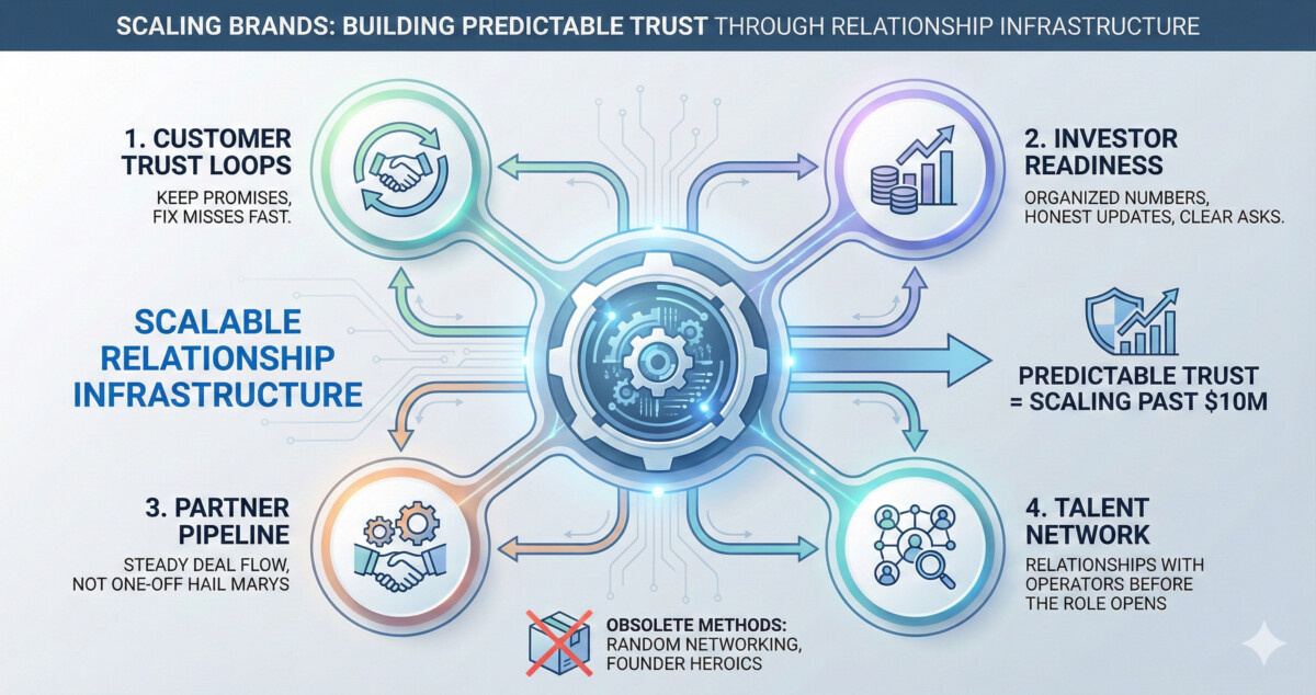 That’s the core idea of this post: brands that scale past $10M build relationship infrastructure the same way they build inventory planning or creative testing. They stop relying on random networking and founder heroics. They run a repeatable system that makes trust predictable across four pillars: