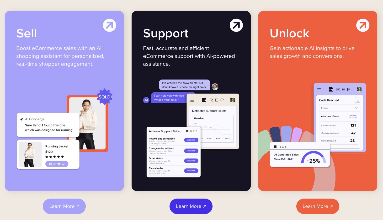 This is where REP AI comes in. REP AI gives ecommerce teams everything they need to launch a powerful agentic experience. It can sell, support, and learn at the level AI shopping agents expect. It also comes with a fast, plug-and-play setup and is scalable.