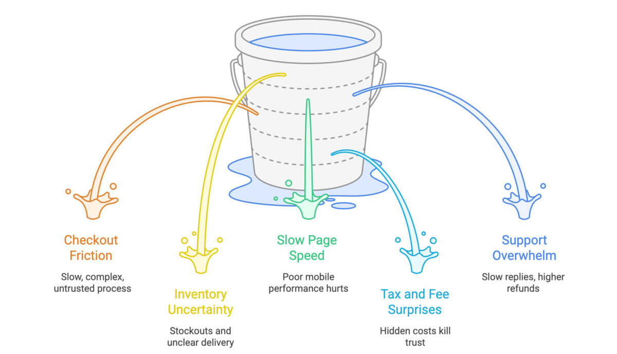 Five common blockers drain profit: checkout friction, inventory uncertainty, slow pages, surprise taxes and fees, and support overwhelm. Each gets worse under peak traffic and on mobile screens. Fixing them improves conversion, protects margin, and reduces refunds.