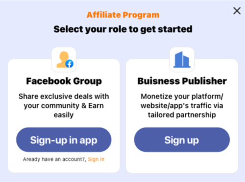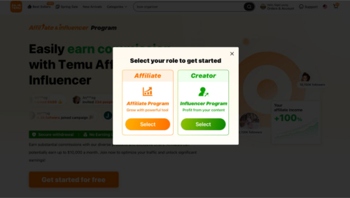 Click to visit the official TEMU Affiliate registration page (or search “TEMU affiliate program”). Choose Affiliate Program to sign up.