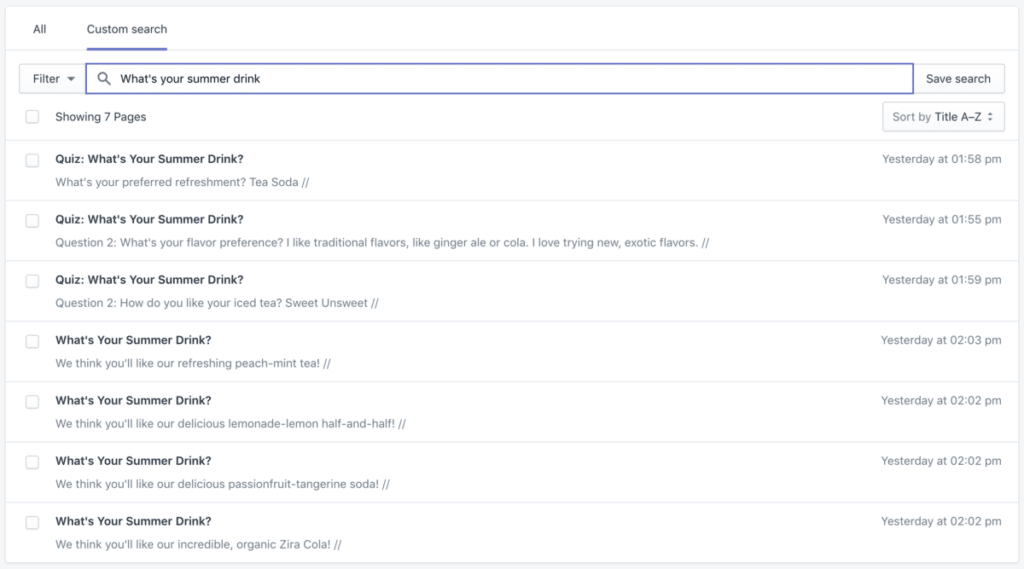 As we mentioned earlier, we created the quiz on our Shopify store; a new page for each question. For our two-question quiz, that had four beverage recommendations at the end, we ended up with seven pages in total. Each answer option on a page linked to a follow-up page.