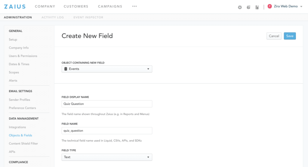 Keep in mind that Zaius can only collect data if the corresponding fields exist. So, next, we created two event fields, Quiz Answer and Quiz Question, under Account Settings > Objects & Fields. We copied and saved the field names for later, as we would use them for our JavaScript tags.