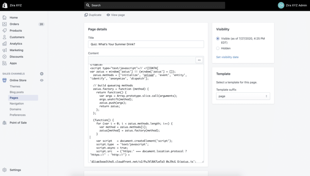 To show you how feasible this smart little project is, we created our own quiz. In our example, we used the simplest, least technically involved way to set up a quick, two-question quiz that would allow us to collect valuable data about our customers: We created new pages on our Shopify store and added the HTML and JavaScript code directly to the pages.