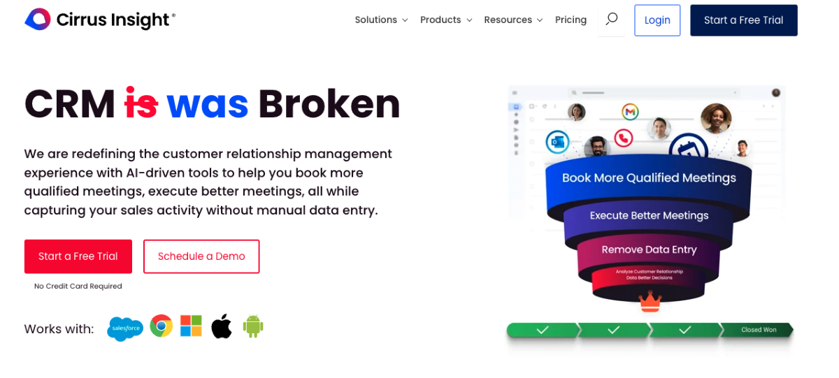 Cirrus Insight is an AI-powered sales automation platform designed to streamline scheduling, meeting preparation, and CRM data capture for sales teams, customer success professionals, and revenue-driven organizations. Our platform helps sales reps book meetings faster, execute high-value conversations, and eliminate the burden of manual data entry. Cirrus Insight integrates directly with Outlook and Gmail, ensuring seamless workflow efficiency without switching between tools.