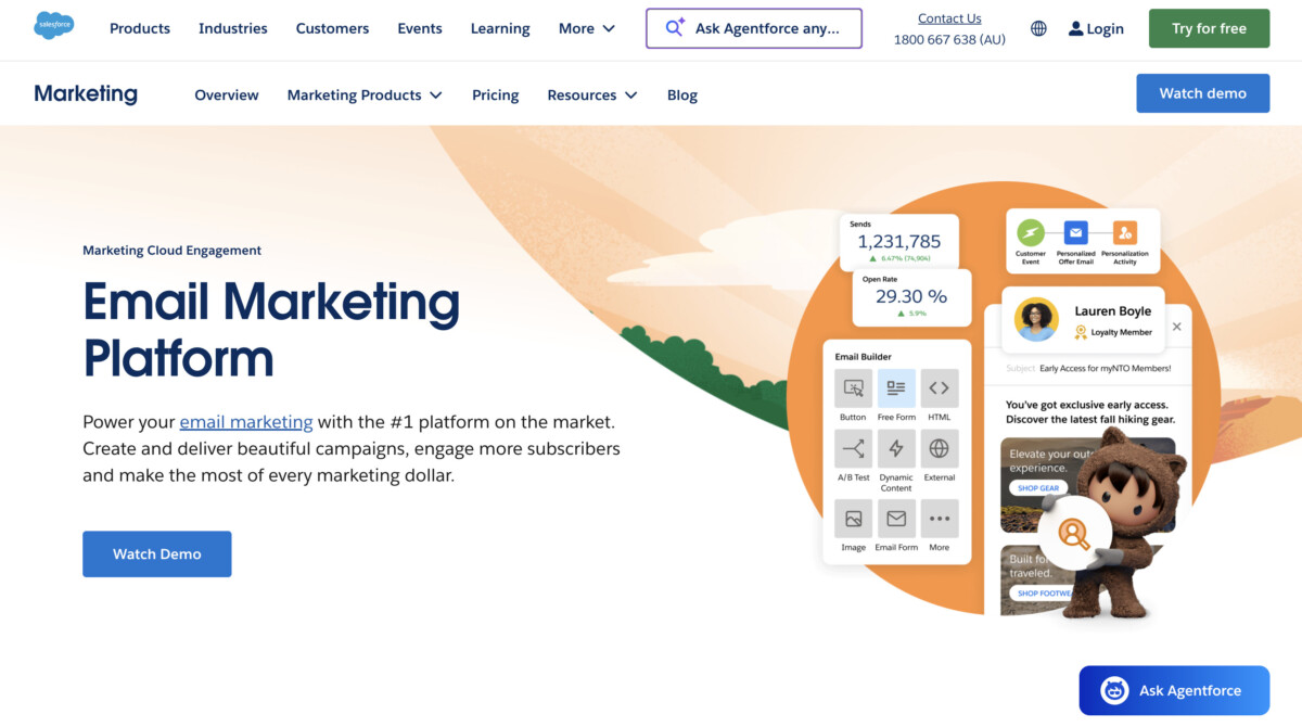 Although the platform doesn’t offer a free tier, Salesforce provides a 30-day trial to test its features. Pricing starts at US $2,000/month, which is higher than most options, but you’re paying for stronger automation, CRM integration, and AI-powered personalization.