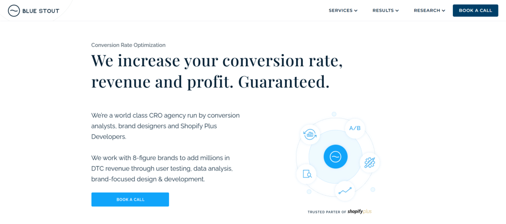 Blue Stout works specifically with eight-figure DTC stores, and their focus on brand-driven CRO means they understand that conversions don’t happen in a vacuum. Your brand perception, visual identity, and messaging all impact whether people buy. They optimize for revenue while maintaining the brand experience that got you this far.