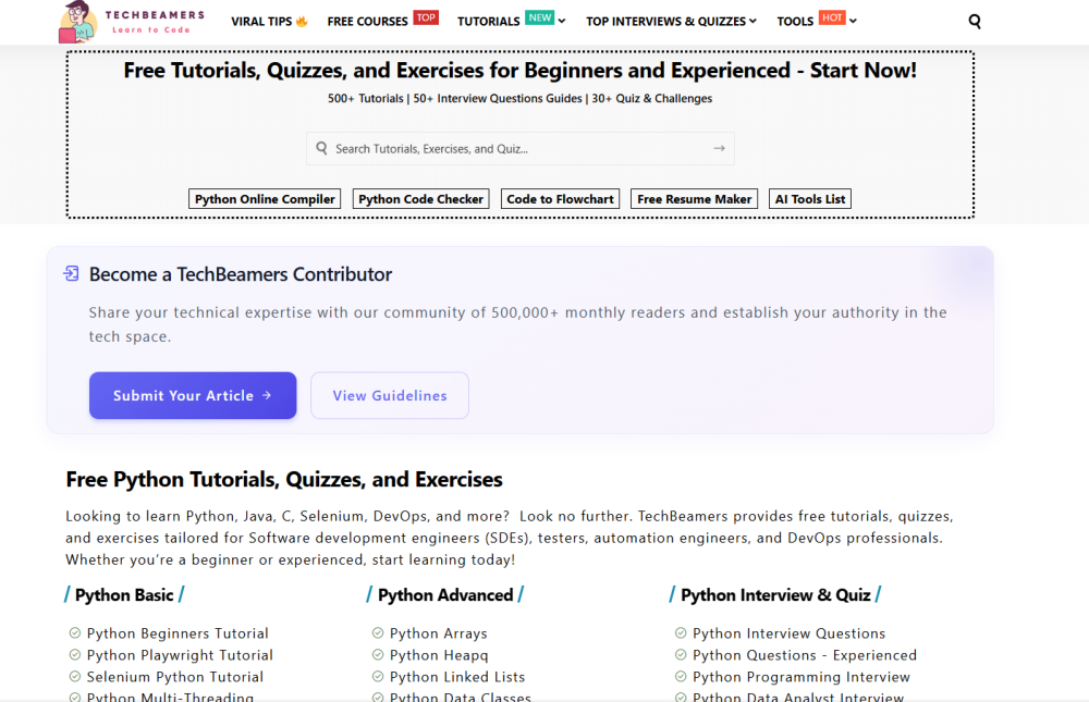 TechBeamers is a valuable educational platform offering tutorials, code examples, and interview preparation guides across Python, Java, Selenium, SQL, and more. Ideal for developers at all levels, it helps users upskill efficiently and stay competitive in the job market.
