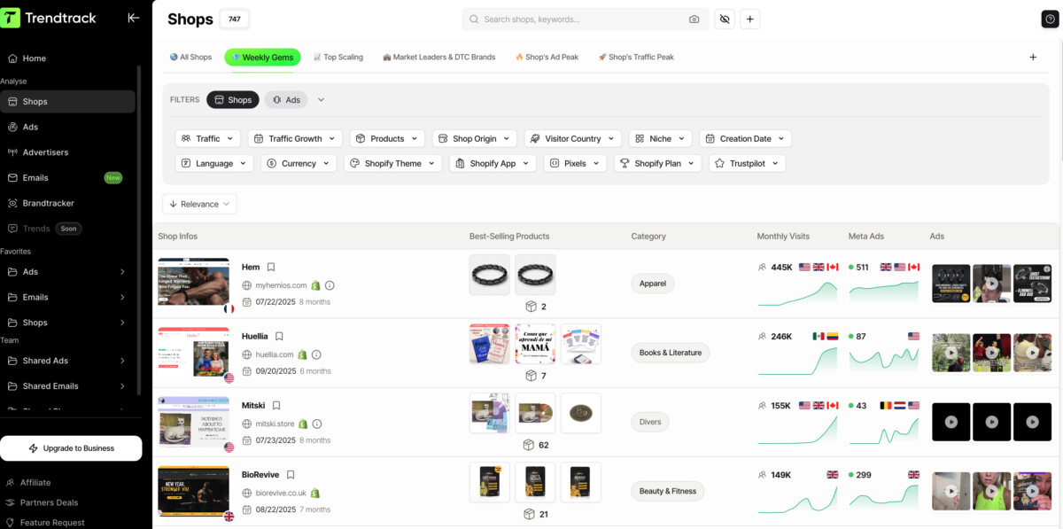 TrendTrack tracks over 300,000 Shopify stores with filters you will not find anywhere else. You can sort by niche, country, traffic volume, weekly growth rate, installed apps, Shopify theme, and more. Each store profile shows estimated monthly traffic, traffic evolution over six months, best-selling products, and the full tech stack behind it.