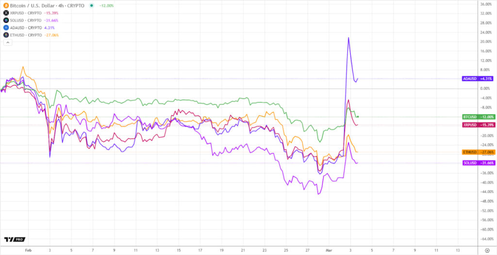 Trump’s announcement had an instant impact on the cryptocurrency market. The Ripple exchange rate has increased by more than 30%, which has become one of the most significant jumps in recent months. Solana has already demonstrated steady growth recently and raised prices by ~25%. Cardano, known for its eco-friendliness and innovative approach to blockchain, has skyrocketed in value by more than 60%. Bitcoin, which updated a three-month low on Friday, rose 10%. Ethereum price also did not stay away, rising by ~13%.