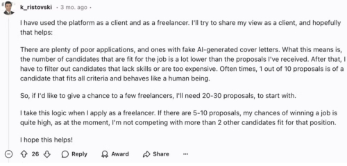 If you’re tired of the bots and bidding wars, check out this Upwork alternative that uses skill-based matching and no public job listings. Trust-based hiring like Upstaff.com does not use AI, and that’s a big deal for both sides.