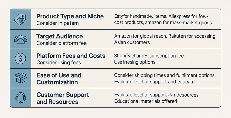 - Evaluate platforms methodically by comparing costs, target audiences, integration features, and shipping options.