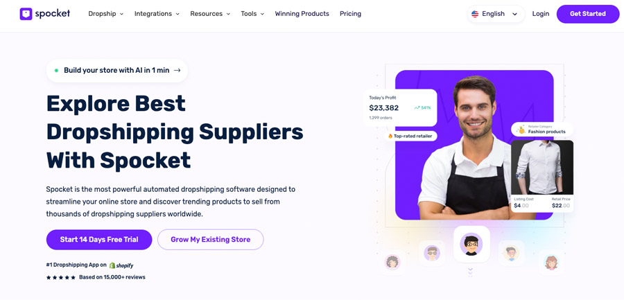 Spocket is a dropshipping platform that connects sellers with US and European suppliers. It offers high-quality products with fast shipping, making it a great option for businesses that want to avoid long delivery times.